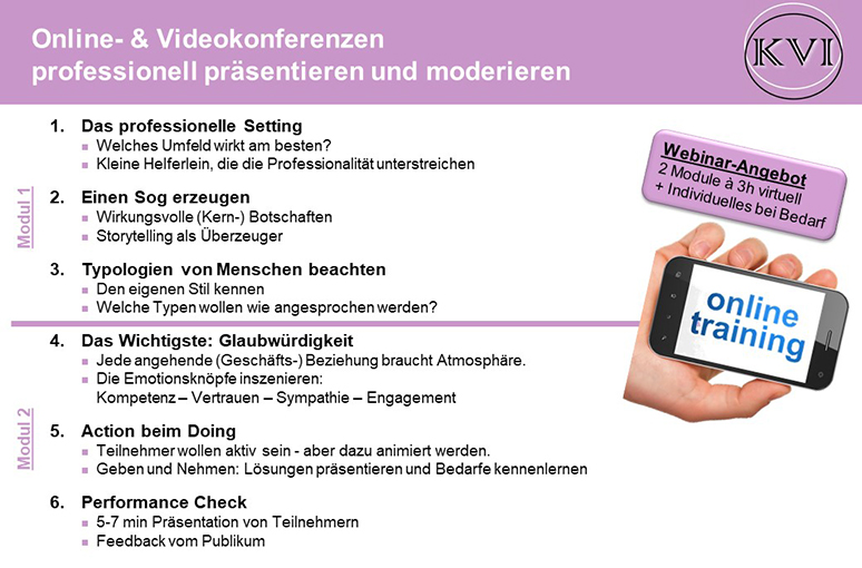 Ein Thema in einem Video oder auf einer Online Konferenz kompakt und fesselnd zu behandeln, ist eine Herausforderung. Die KVI Initiative hat ein spezielles Online Training konzipiert, um Sie fit für die Präsentationstechniken der Zukunft zu machen.